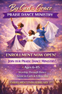 Open Enrollment is now open for our By God’s Grace Praise Dance Ministry. Join us Feb 1st, 2026 for our first enrollment meeting. See Jazmyn Lee, Jaide Lee, or Jasmine Williams for more information.
